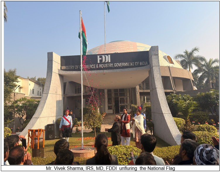 At the FDDI-HO & Noida Campus, the National Flag was unfurled by Mr. Vivek Sharma, IRS, Managing Director (MD), FDDI, in the presence of the Executive Director Noida Campus, faculty members, employees, and students.