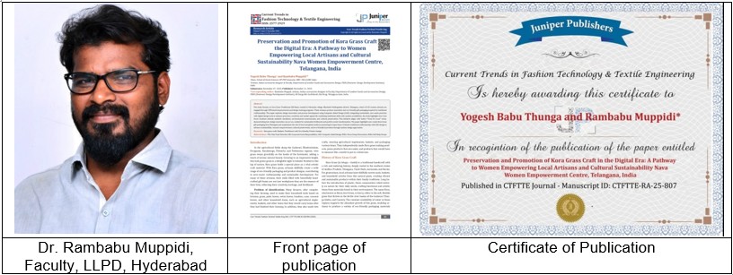 Dr. Rambabu Muppidi, Faculty, LLPD at FDDI Hyderabad, has published a research paper in the USA-based journal Current Trends in Fashion Technology & Textile Engineering (CTFTTE), November 2025 issue. Titled “Preservation and Promotion of Kora Grass Craft in the Digital Era: A Pathway to Women Empowering Local Artisans and Cultural Sustainability – Nava Women Empowerment Centre, Telangana, India”, co-authored with Dr. Yogesh Babu Thunga, the study focuses on traditional Kora Grass Craft, including eco-friendly bags and gift articles.