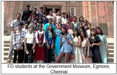 On 16 February 2026, the II Year B.Des Fashion Design (FD) students of FDDI, Chennai Campus, accompanied by faculty members, visited the Government Museum, Egmore, Chennai, renowned for its rich and diverse collection of textiles, sculptures, paintings, and archaeological artifacts. The visit commenced with a guided tour of the textile and art galleries, where students explored exhibits showcasing ancient weaving techniques, handwoven fabrics, natural dyeing processes, intricate embroidery styles, and traditional attire representing various periods of Indian history. The galleries featuring temple sculptures and paintings further enhanced students’ understanding of historical draping styles, motifs, and ornamentation used in traditional fashion.