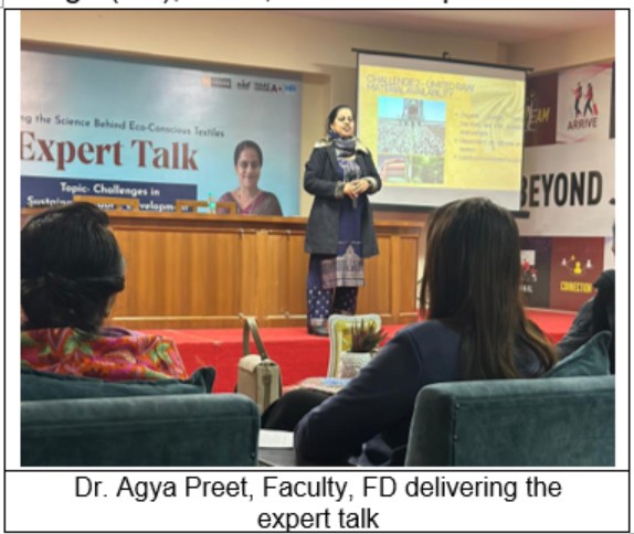 Dr. Agya Preet, Faculty, School of Fashion Design (FD), FDDI, Banur Campus delivered an exclusive expert talk on “Challenges in Sustainable Fabric Development,” at CGC University, Mohali on 22nd January 2026 offering students valuable insights into the evolving landscape of sustainable textiles. The session fostered a meaningful exchange of ideas, with focused discussions on critical challenges such as responsible material sourcing, technological limitations, scalability concerns, and the pivotal role designers play in driving environmentally conscious innovation.