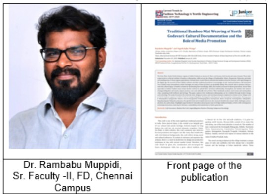A research paper titled, ‘Traditional Bamboo Mat Weaving of North Godavari: Cultural Documentation and the Role of Media Promotion’ authored by Dr. Rambabu Muppidi, Senior Faculty–II, School of Fashion Design (FD), FDDI Chennai Campus, along with Dr. Yogesh Babu, former Assistant Professor, Nagarjuna University, has been published in the USA-based international journal Current Trends in Fashion Technology & Textile Engineering (CTFTTE) (ISSN: 2577-2929), California, in January 2026.