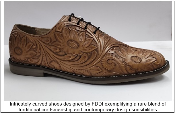 Elaborating on the creative process, Mr. Varun Gupta, Senior Faculty Member, explained that the craftsmanship involved a meticulous technique comparable to fine wood carving, wherein detailed patterns were hand-sculpted with precision and patience. This labour-intensive approach demanded exceptional skill, artistic vision, and technical expertise, transforming the footwear into a piece of functional art. The exhibit not only highlighted FDDI’s commitment to innovation, design excellence, and material exploration, but also underscored the institute’s ability to reinterpret traditional artisanal techniques within modern footwear design, reinforcing its role as a hub for creativity and craftsmanship in the leather and footwear sector.