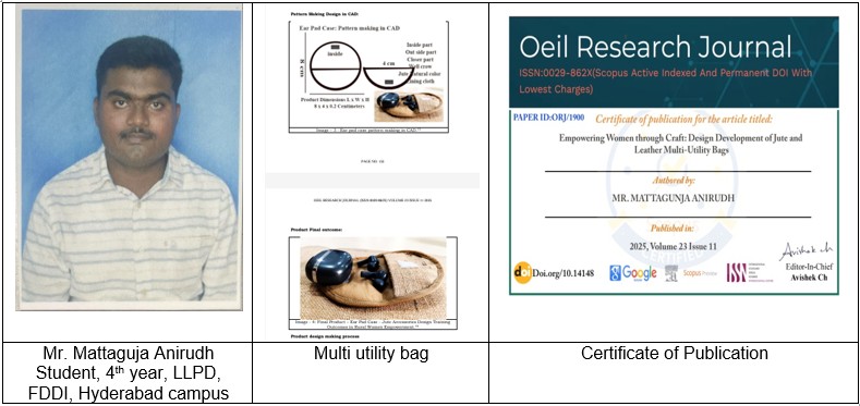 The paper, titled “Empowering Women through Craft: Design Development of Jute and Leather Multi-Utility Bags,” appears in Volume 23, Issue 11, November 2025, and focuses on sustainable craft-based product development in collaboration with the Nava Women Empowerment Centre, Bhadradri Kothagudem District, Telangana available at https://oeilresearch.com/volume-23-issue-11-2025/