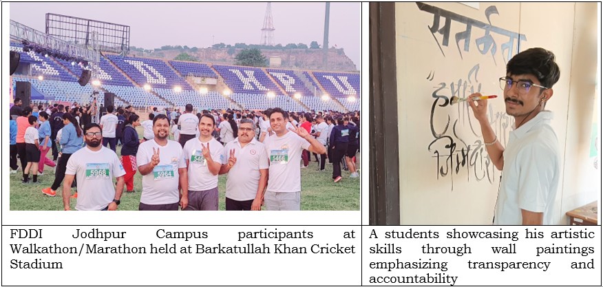 At the FDDI Jodhpur Campus, Vigilance Awareness Week was celebrated with enthusiastic participation from both students and staff. The observance began with the administration of the Integrity Pledge by all, reaffirming their commitment to honesty and ethical behaviour. As part of the community engagement initiative, students visited Gram Sabha, Keru, where they conducted a pamphlet distribution drive to raise awareness about vigilance and anti-corruption practices among local residents. A slogan and poster writing competition that encouraged creative expressions on the theme of vigilance was also held. A special session on Workplace Ethics, delivered by Dr. Alok Tripathi (Retd. IPS), Hon’ble Vice Chancellor of Sardar Patel University of Police, Security & Criminal Justice, Jodhpur, inspired participants to uphold integrity and ethical conduct in professional life. Students also showcased their artistic skills through wall paintings emphasizing transparency and accountability, while a Walkathon/Marathon held at Barkatullah Khan Cricket Stadium promoted the message of vigilance and integrity through collective participation. The week concluded with a closing ceremony and felicitation of students and staff for their enthusiastic involvement and contributions.