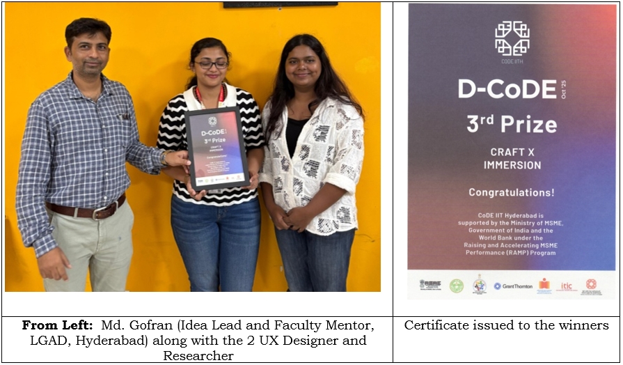 The team Craft X Immersion from the School of Leather Goods and Accessories Design (LGAD), FDDI, Hyderabad, showcased outstanding innovation and design acumen by winning the 3rd Prize at D-CoDE’25, a design-led innovation hackathon organized by the Centre of Design Excellence (CoDE), IIT Hyderabad, under the RAMP (Raising and Accelerating MSME Productivity) initiative.